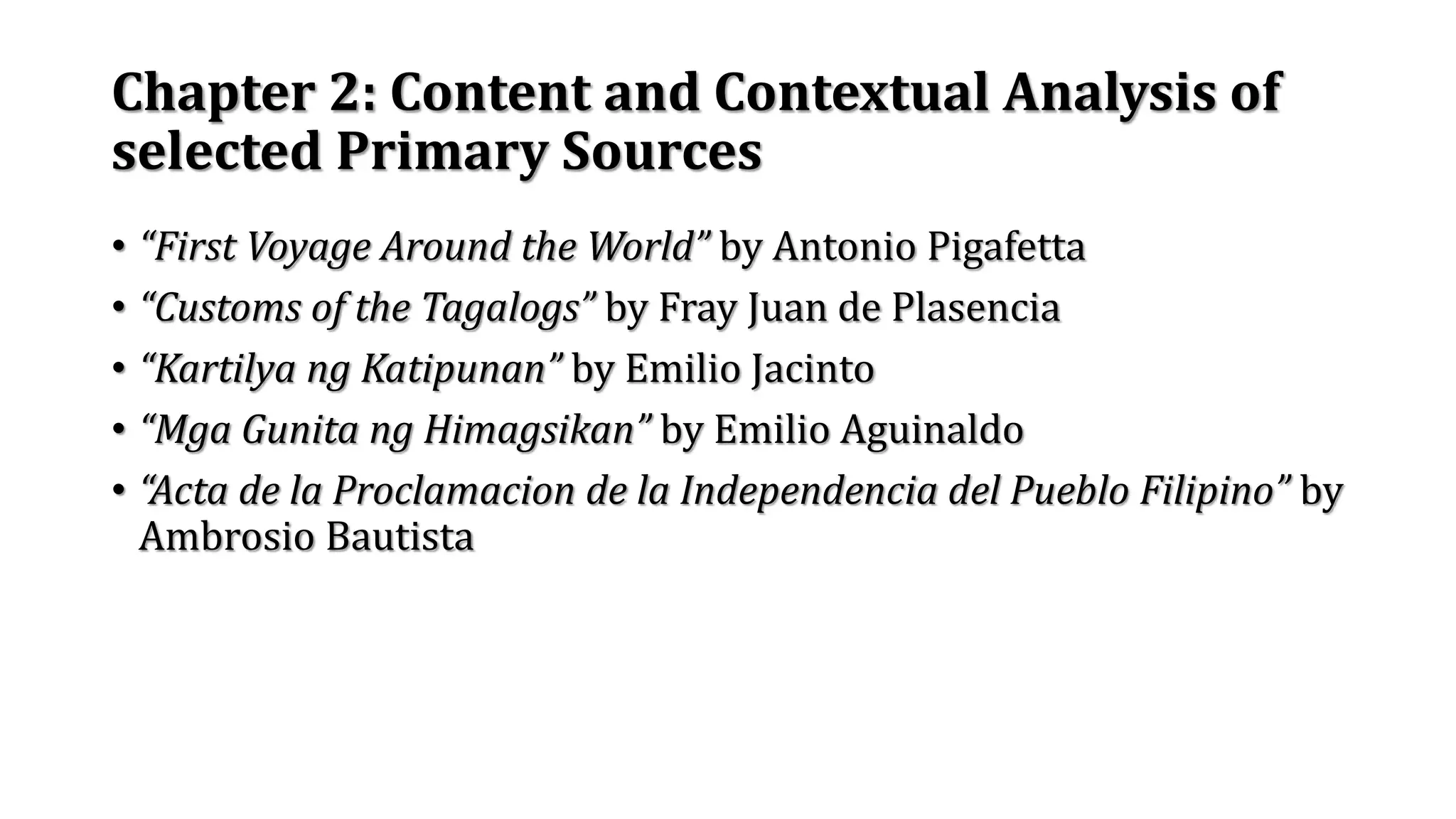 Chapter 2 provides a content and contextual analysis of selected primary Philippine historical sources, including accounts from Pigafetta, de Plasencia, Jacinto, Aguinaldo, and others. This analysis highlights their historical significance, authors' backgrounds, and main arguments, illustrating key events in Philippine history such as Magellan's voyage, the customs of the Tagalogs, and the Philippine revolution. It serves as a comprehensive overview of the socio-political landscape during these periods, emphasizing the importance of these texts in understanding Philippine history.