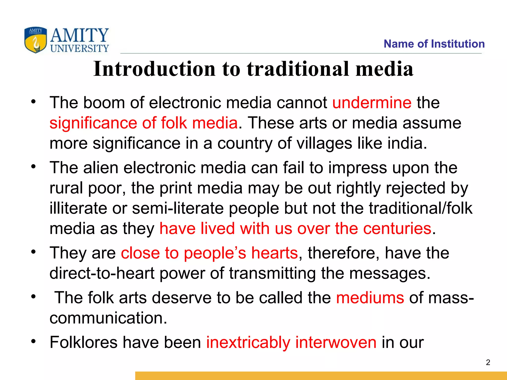 Traditional folk media like folk dances, dramas, and songs are still important ways to communicate with rural populations in India given high illiteracy rates. These forms are integrated with local languages and customs and can effectively spread messages about development issues from health to education to rights. Government and nonprofit organizations increasingly utilize folk media for social marketing and development communication because these forms attract large audiences, are economical, and impart messages subtly without audiences realizing they are being taught.