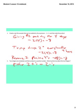 The document outlines the homework assignments for Module 2 Lesson 12, which includes completing a problem set, submitting CRS #7, and preparing for Exam 3 on November 25th. It also provides lesson content on integers and rational numbers, examples of rational number operations, and closing questions about the relationship between multiplying and dividing integers and the resulting sign of quotients.