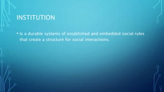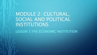 Economic institutions are the formal and informal rules that organize economic activity in a society. They work to answer questions about what goods and services should be produced, how they should be produced, and for whom. Other key aspects of economics addressed by institutions include reciprocity through gift exchange, redistribution through taxation and welfare, and different types of market transactions like purchases, loans, mortgages, and bank accounts. Economic institutions help define the relationship between market forces and the role of the state.