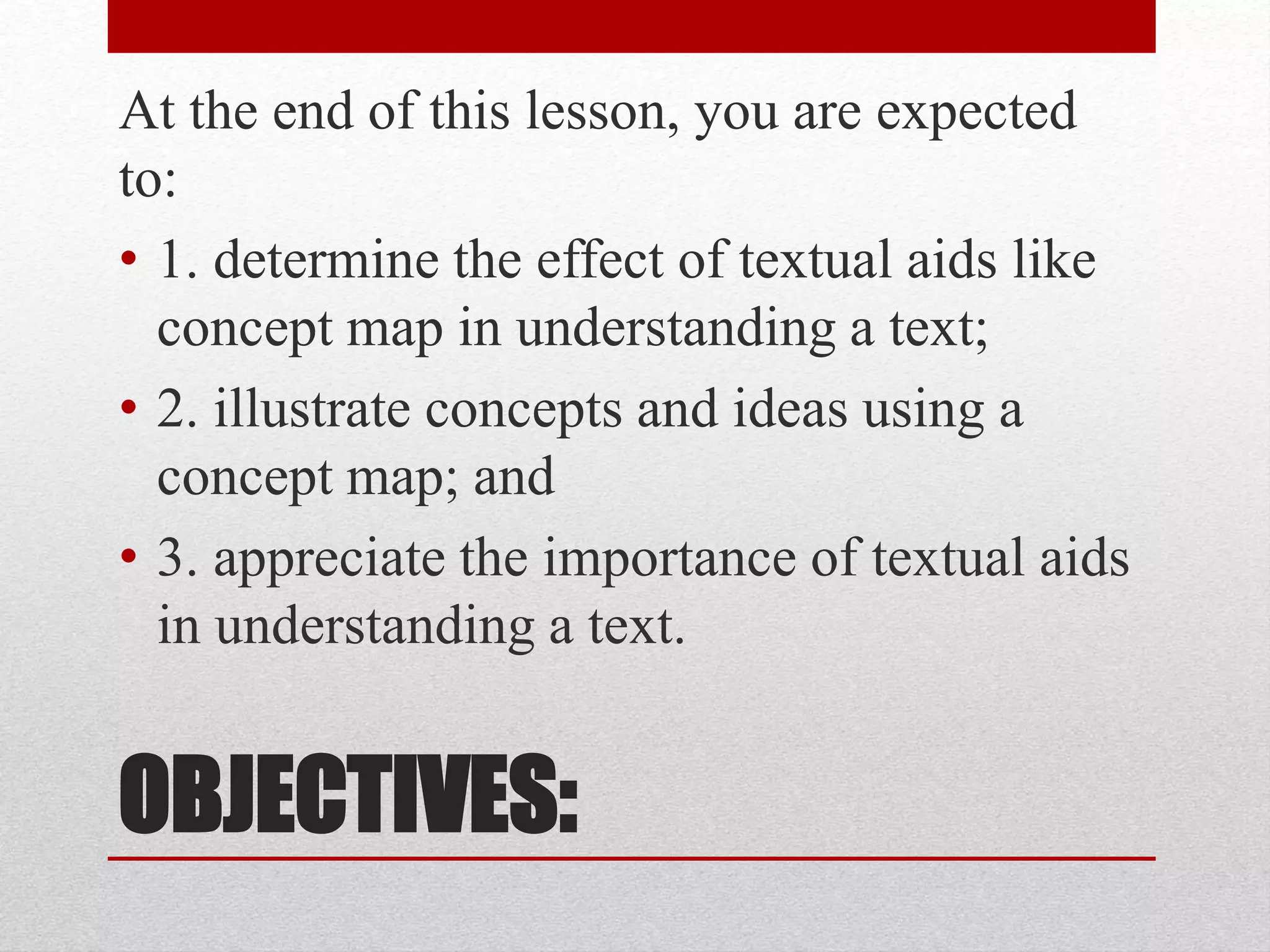 This document discusses concept maps and their importance as a textual aid. It defines a concept map as a visual representation of knowledge that shows concepts and their relationships through diagrams connected by arrows. Concept maps help visual learners grasp materials by illustrating relationships between ideas. They are created by writing key concepts in shapes and connecting them with arrows and explanations. The document emphasizes that concept maps clarify and structure understanding as well as aid in memory recall.