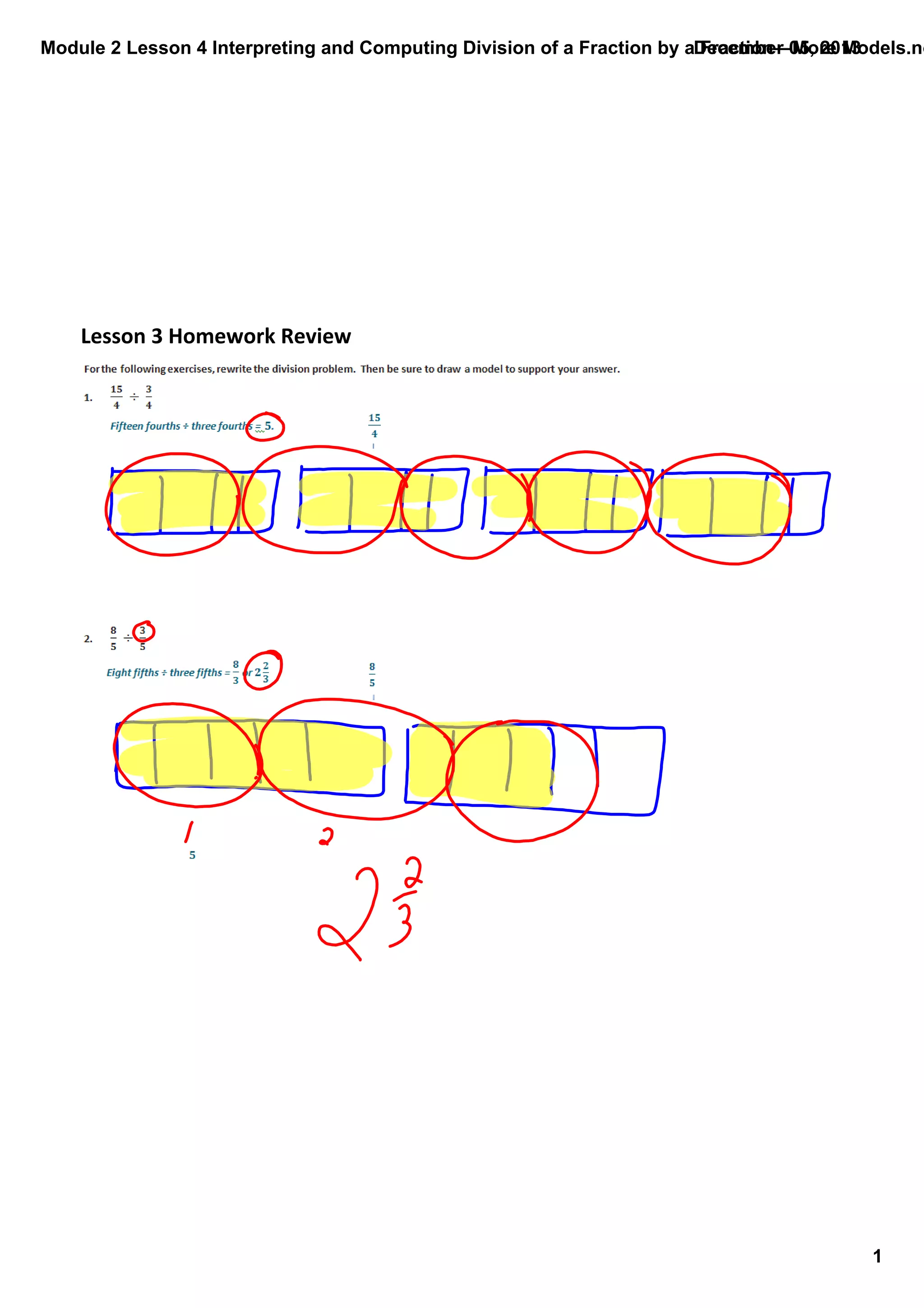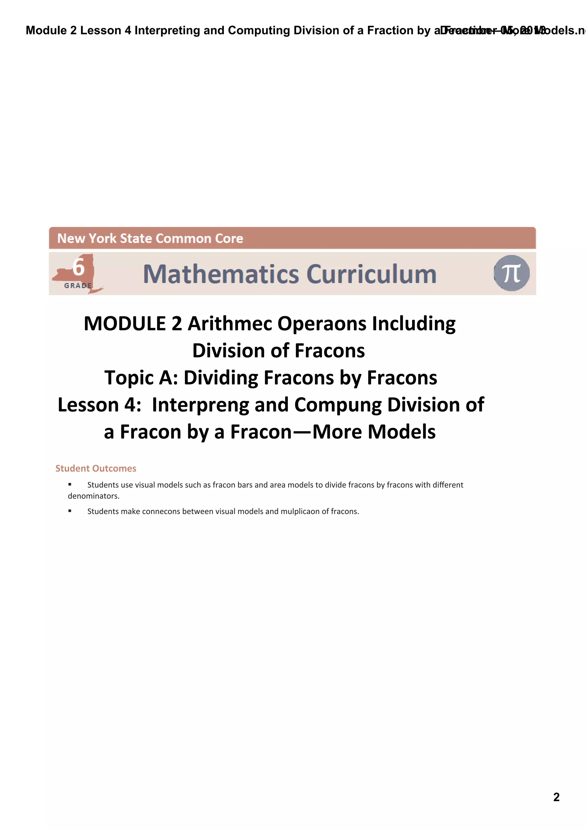 This document is a lesson plan on interpreting and computing division of fractions by fractions using visual models. The lesson introduces dividing fractions with different denominators using fraction bars and area models. Students will practice dividing fractions with models and be asked to consider if division of fractions can result in whole number quotients or answers larger than the dividend. The lesson concludes with an exit ticket to assess student understanding.