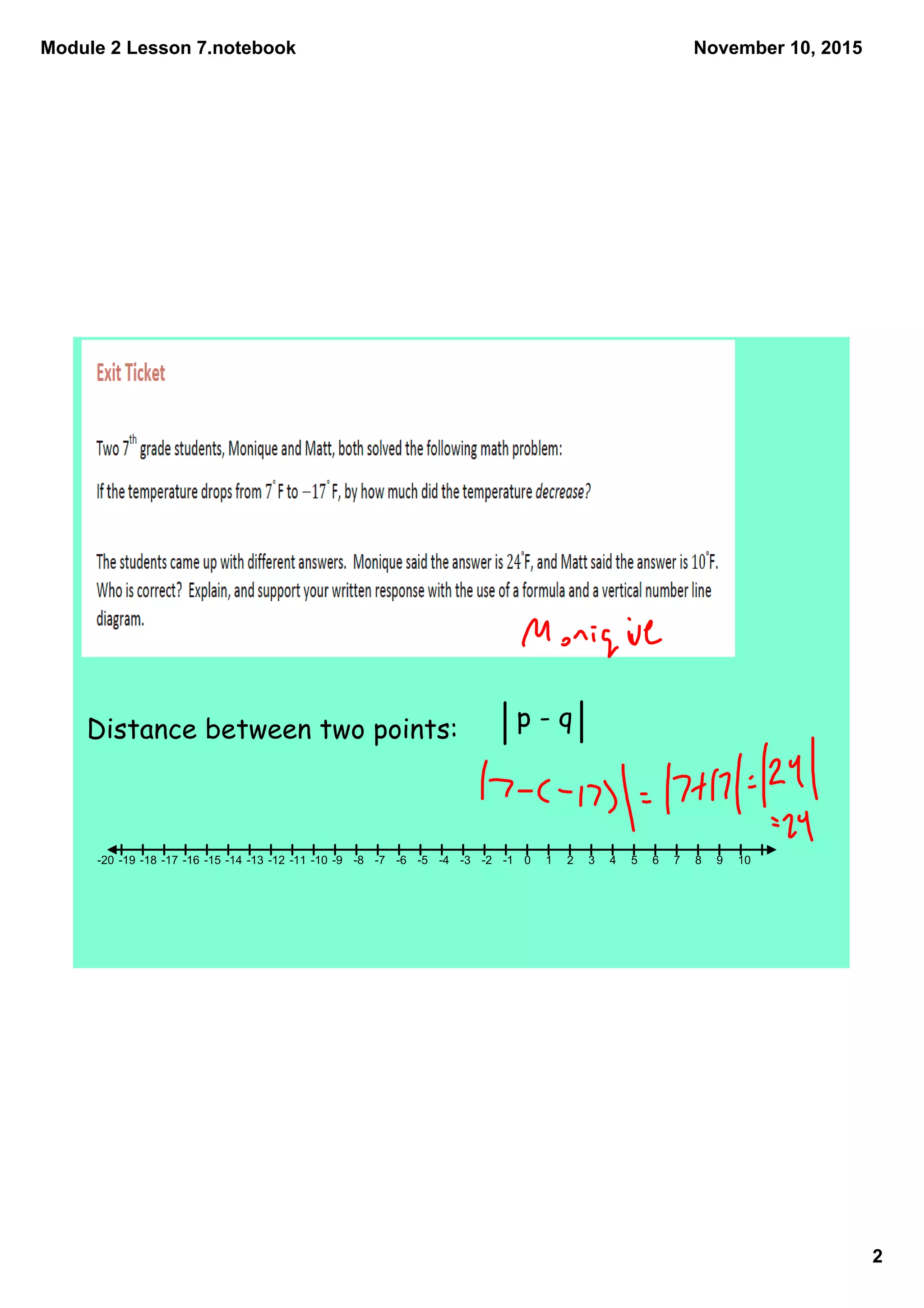 This document outlines lessons from Module 2 on adding and subtracting rational numbers. It includes examples of number line models demonstrating how to find the sums and differences of integers. Students are assigned problems from the lesson set and an integer sprint. The closing questions ask about challenges of using the number line model for non-integer rational numbers and how to interpret an arrow on the number line representing the addition of a decimal amount.