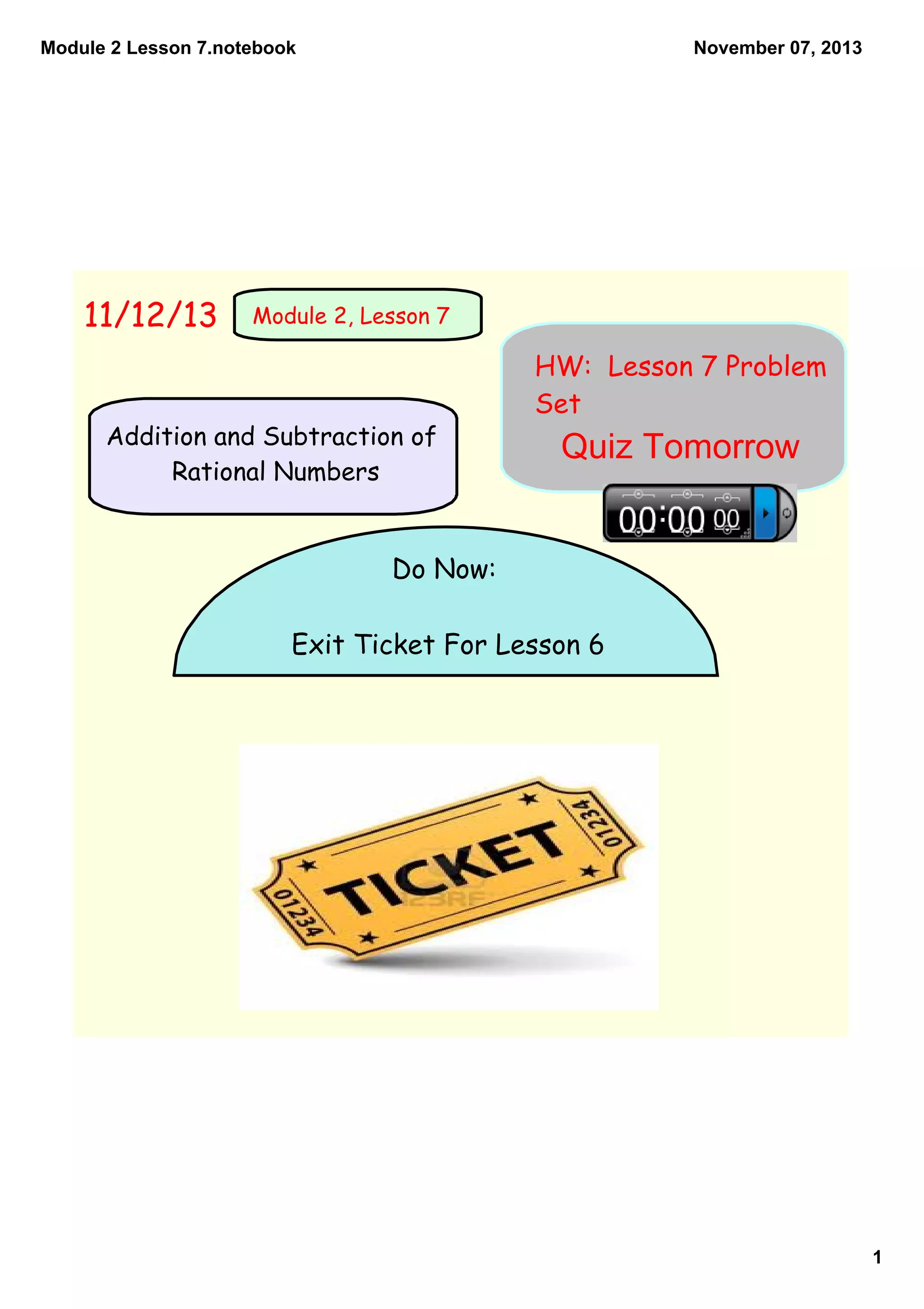 This document contains notes from a math lesson on adding and subtracting rational numbers. It includes examples of problems involving adding and subtracting integers using a number line. It also previews a homework assignment on rational number addition and subtraction and quizzes students on exit tickets from the previous lesson. Finally, it poses closing questions about using a number line to model operations with rational numbers.