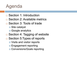This document provides an overview of on-site web analytics. It discusses available metrics like visits, page views, bounce rate, and others. It covers popular analytics tools like Omniture SiteCatalyst and Google Analytics. SiteCatalyst is an enterprise solution that requires technical implementation of tagging, while Google Analytics offers easier free tagging. The document discusses types of tags for page level, events, custom metrics, and campaigns. Implementing proper tagging is important for analytics tools to capture useful data. Overall, the document provides a high-level introduction to key concepts in on-site web analytics.