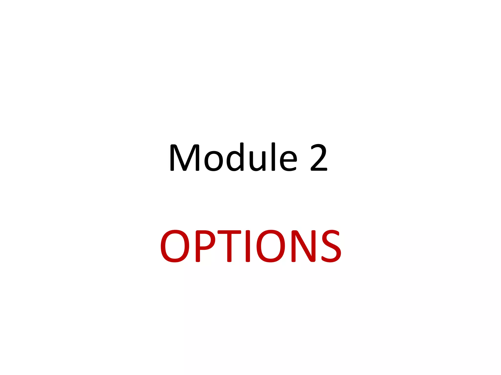The document provides an overview of options terminology and concepts. It defines an option as a contract that gives the buyer the right, but not the obligation, to buy or sell an underlying asset at a predetermined price on or before a specified date. It also describes the key characteristics of call and put options, American and European style options, factors that affect option value, and the Black-Scholes options pricing model.