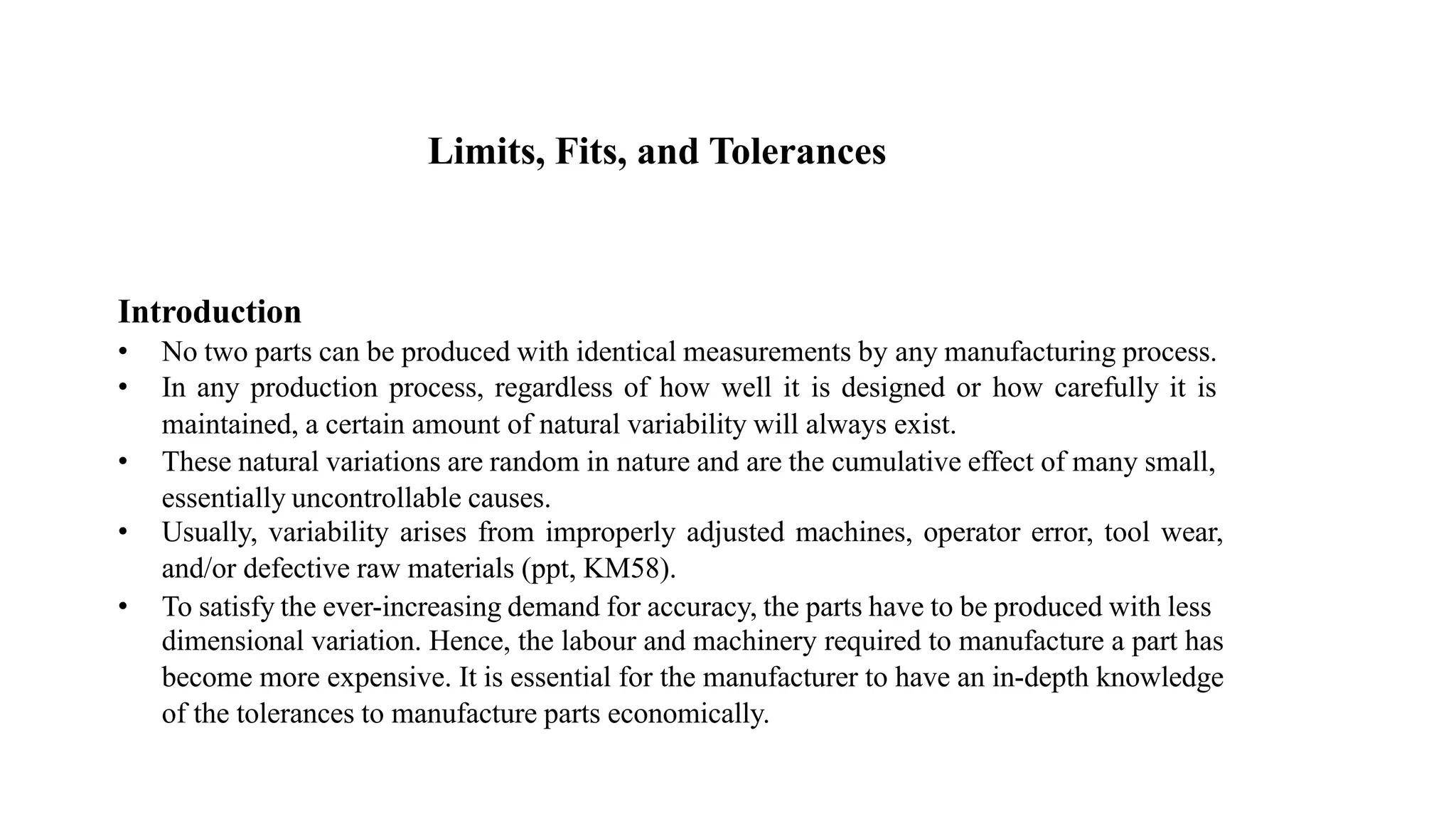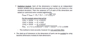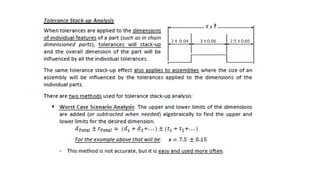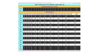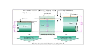 The document discusses limits, fits, and tolerances in manufacturing. It defines key terms like basic size, tolerance, deviation, allowance and different types of fits and tolerances. Tolerance is specified to indicate the permissible variation in a part's actual size from its nominal dimensions. Allowance refers to the intentional difference between mating features to achieve a desired fit. The document also discusses principles of interchangeability and how tolerances are accumulated in an assembly. Maximizing interchangeability requires minimizing the effects of tolerance stacking.