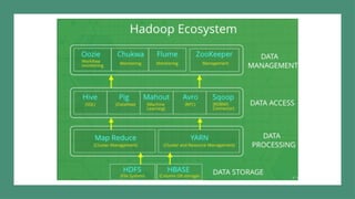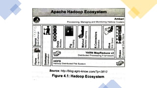 The document provides an overview of the Hadoop ecosystem, emphasizing its role in processing large datasets through distributed computing. It highlights the architecture of the Hadoop Distributed File System (HDFS), detailing the functions of the namenode and datanodes, and how the system manages data replication and node failure. Additionally, it discusses the necessity of various components within the ecosystem to effectively deal with big data challenges.