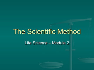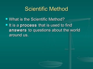 The document discusses the scientific method, which is a process used by scientists to investigate questions about the natural world through organized and reliable experiments. There are several versions of the scientific method, but they generally involve identifying a problem, developing a hypothesis to test, designing an experiment to collect data, analyzing the results, and communicating the conclusions. The goal of science is to understand the natural world by proposing explanations that can be tested through examination of evidence in a careful and systematic way.