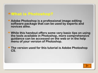 This document provides an overview of Adobe Photoshop, including descriptions of the main work area, tools, and how to perform basic tasks like resizing images, modifying color, using layers, and some drawing tools. The work area includes menus, toolboxes, palettes, and options to access commands and edit images. Basic tools are demonstrated for selecting, brushing, penciling, and patching. Modifying color and using layers to edit parts of an image separately are also outlined.