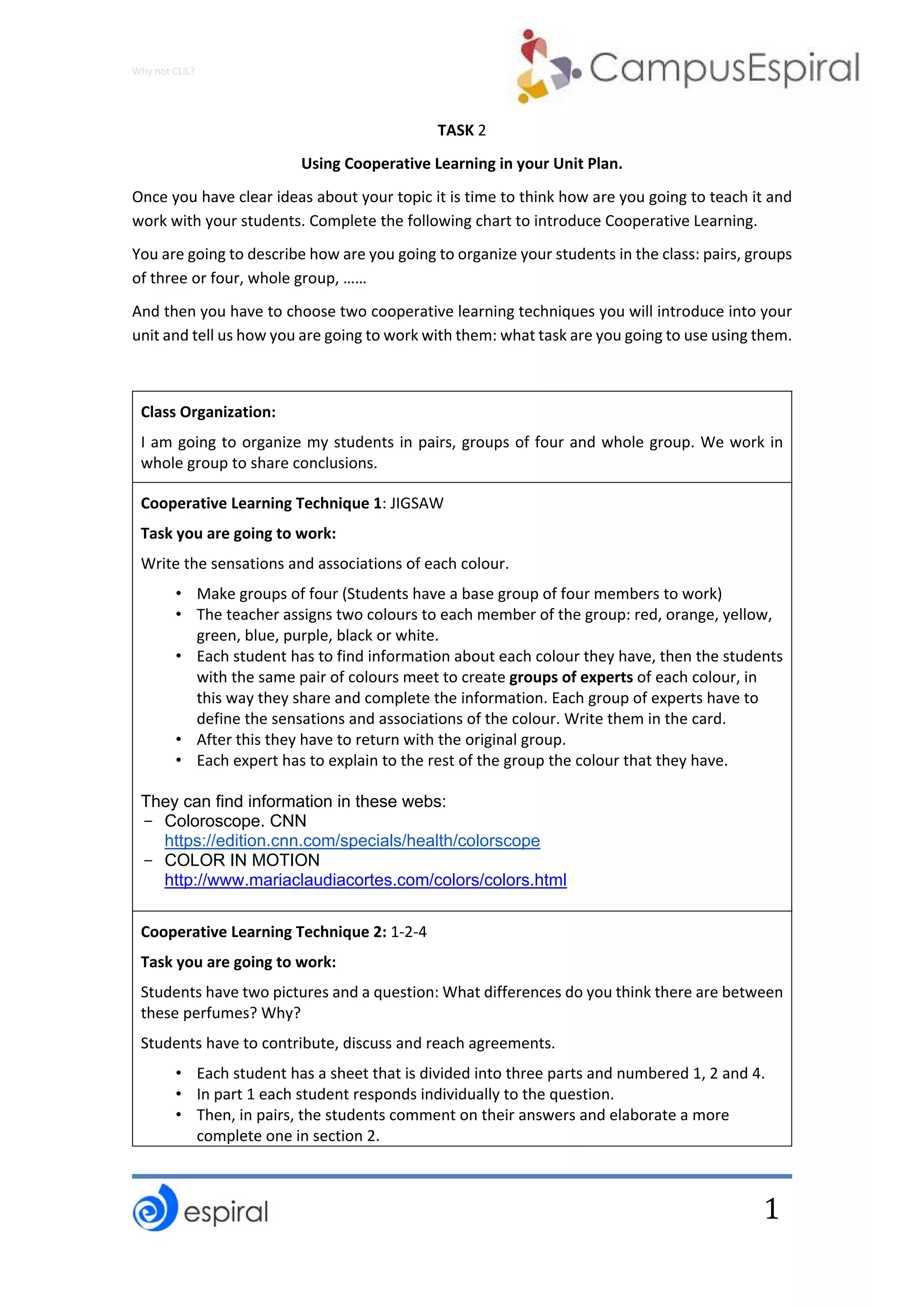 The document describes how a teacher plans to organize students and use cooperative learning techniques in a unit plan. The teacher will organize students in pairs, groups of four, and as a whole group. Two cooperative learning techniques are described: Jigsaw, where students are assigned colors and meet in expert groups to share information before returning to original groups, and 1-2-4, where students answer questions individually, in pairs, and finally in groups of four, contributing to a definitive answer.