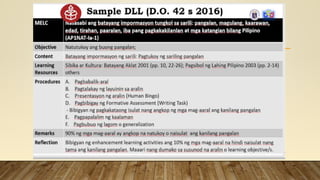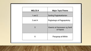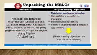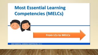 This document provides information on the Most Essential Learning Competencies (MELCS) in the Philippines for School Year 2020-2021. It discusses the rationale for developing the MELCs due to the impacts of the COVID-19 pandemic on education. It explains that the MELCs were identified by reducing the number of competencies per quarter from the original curriculum to the most essential ones. The document provides examples of MELCs and gives guidance on how to unpack the MELCs into learning objectives by considering standards, prerequisite skills, and logical sequencing. The goal of the MELCs is to continue providing quality, accessible education while addressing the challenges of the current situation.