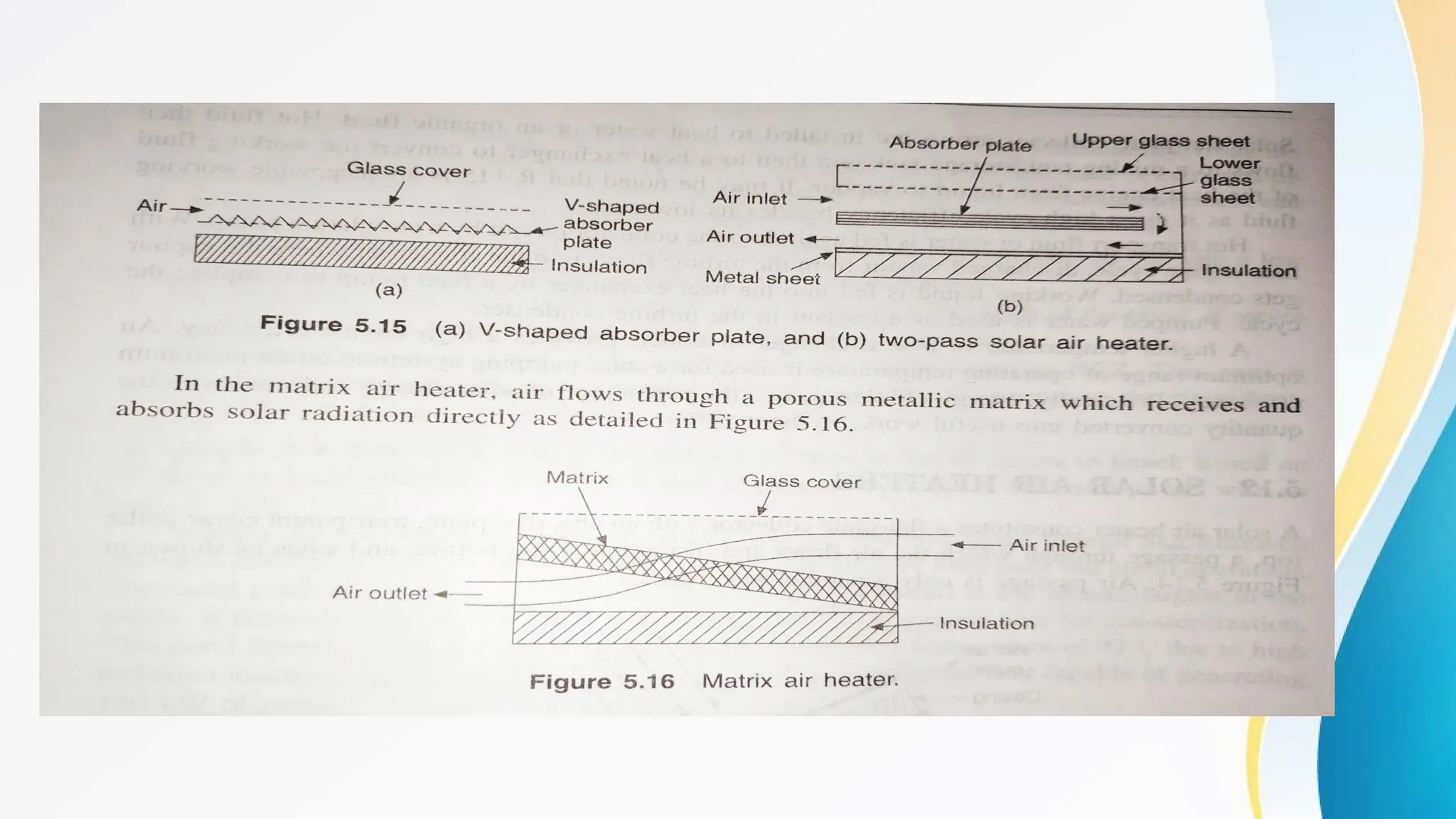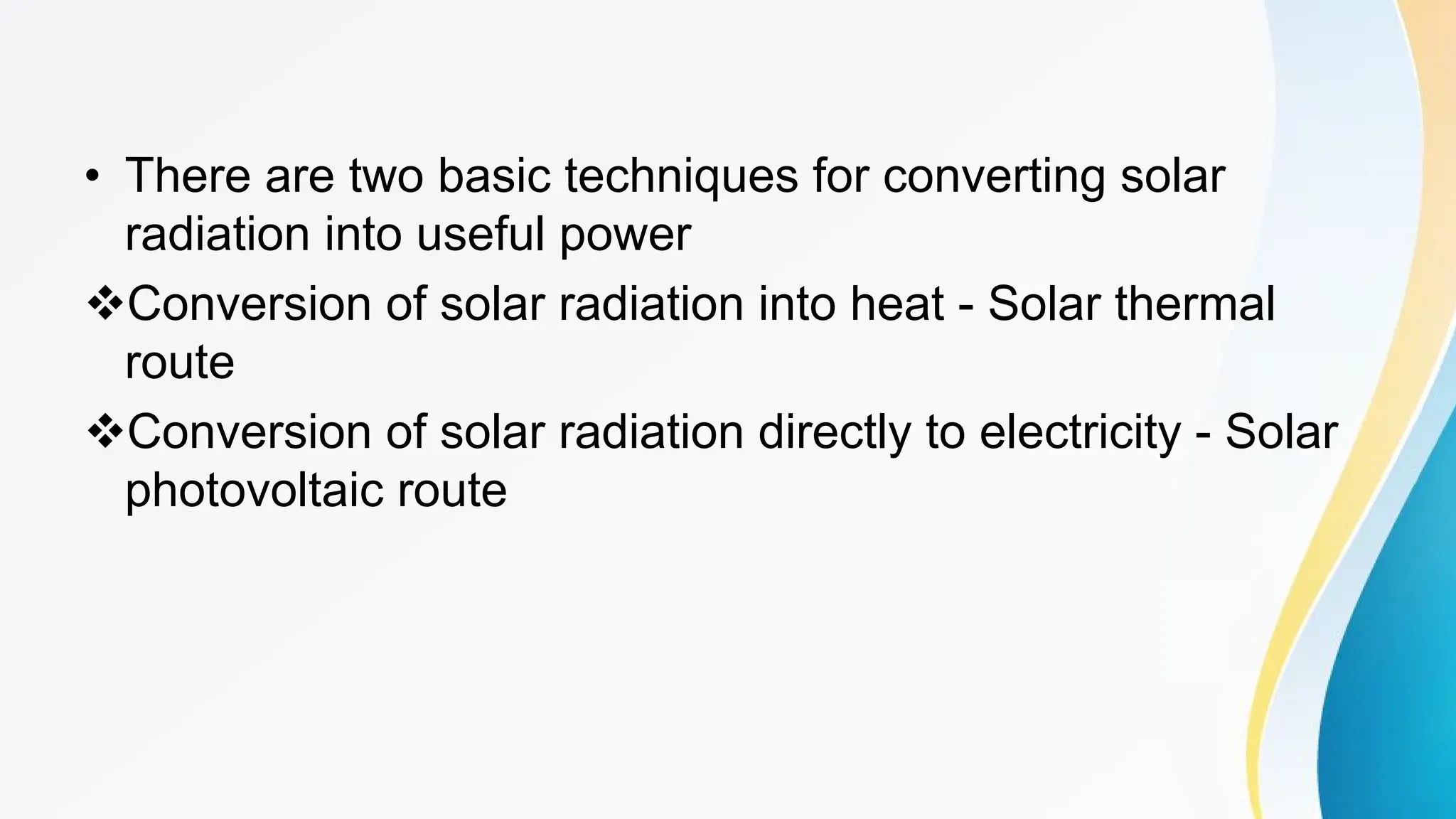 This document discusses various techniques for harnessing solar energy, including solar thermal and photovoltaic methods. It describes different types of solar collectors like flat plate collectors and concentrating collectors. It also discusses solar thermal energy storage methods like sensible heat storage using water or molten salts, latent heat storage using phase change materials, and thermochemical storage using reversible chemical reactions.