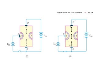 2) The construction and working of JFETs, which use a reverse-biased pn junction to control the width of a conducting channel between source and drain terminals. Narrowing the channel reduces current flow.
