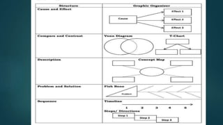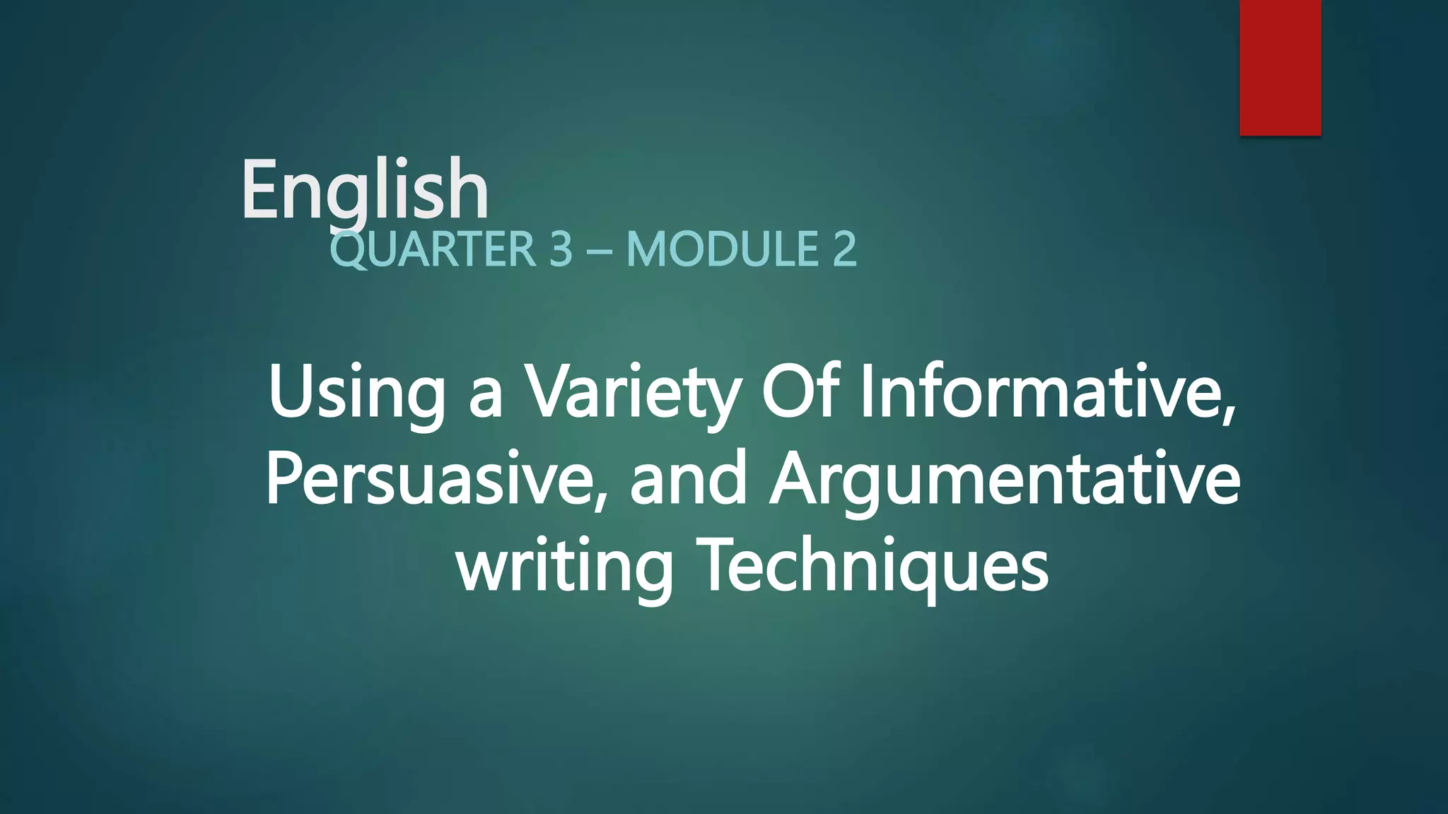 This document provides information about persuasive and informative writing techniques. It discusses the structure of informative texts and their purpose of providing clear facts. It also discusses persuasive writing techniques, including Aristotle's modes of persuasion (ethos, pathos, logos), and the typical parts of a persuasive essay such as the introductory paragraph, body paragraphs, and concluding paragraph. The document provides examples and definitions to illustrate informative and persuasive writing concepts.
