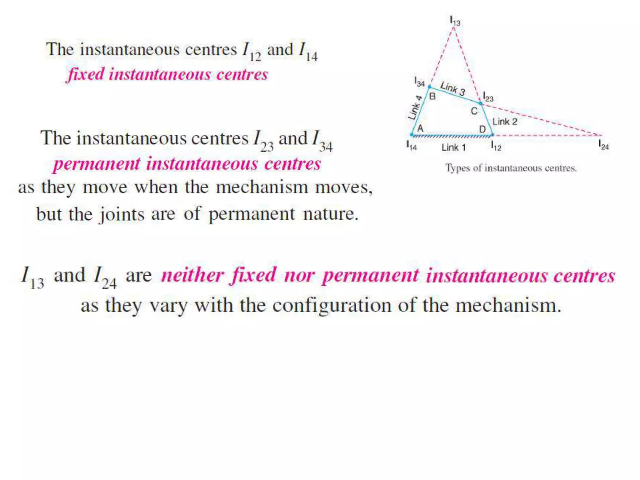 3. The instantaneous center method assumes the link rotates about a single center, making it easier for simple mechanisms. This center lies at intersections of bisectors.