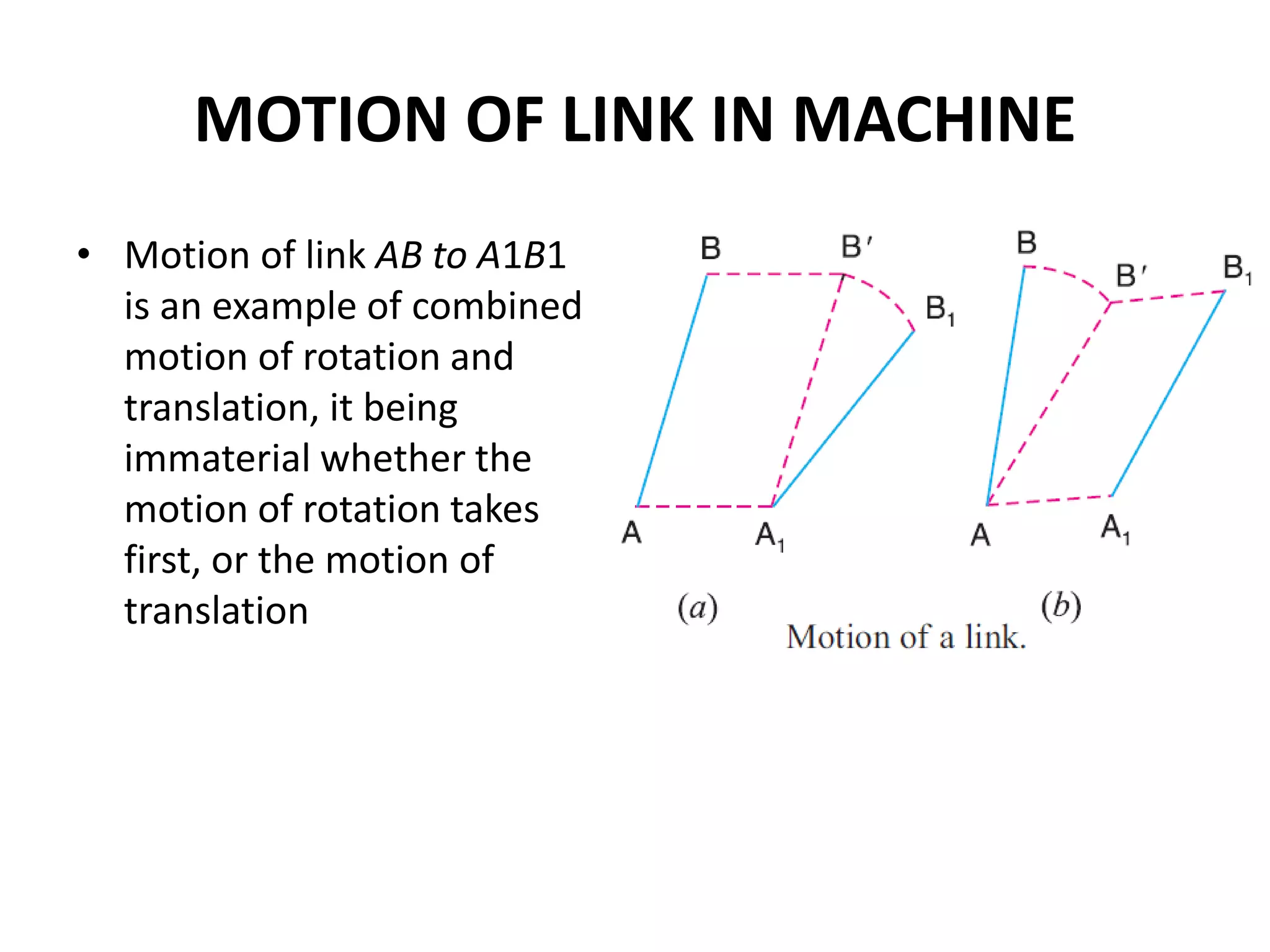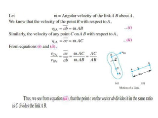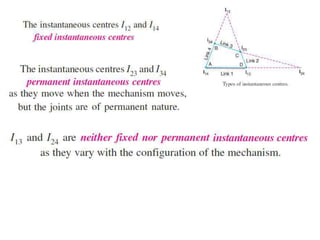 1. Two methods are described for determining the velocity of points on moving links: the relative velocity method and instantaneous center method.