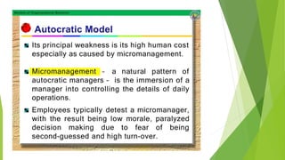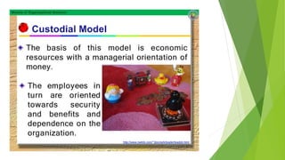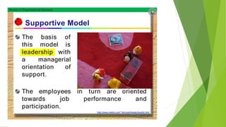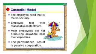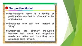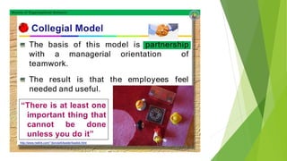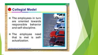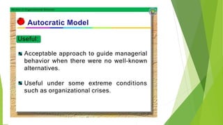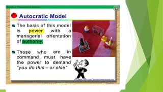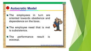 This document discusses five models of organizational behavior: autocratic, custodial, supportive, collegial, and system. It provides characteristics of each model, including their basis of power/control, managerial orientation, employee orientation, employee psychological results, and performance results. The system model emphasizes ethics, integrity, trust and community over economic goals. It aims to motivate self-actualized workers who find meaning and passion through achieving organizational goals.