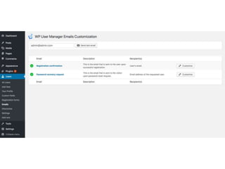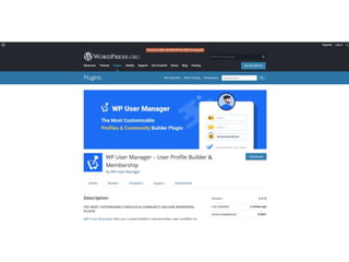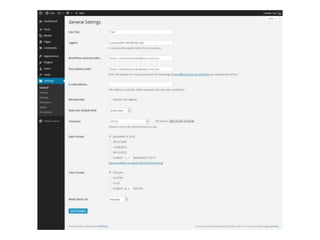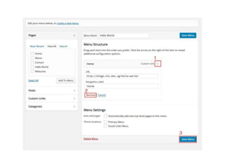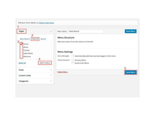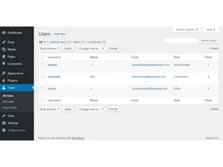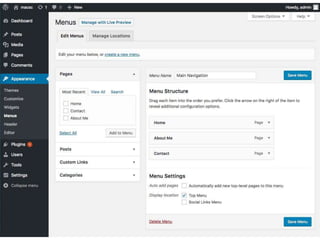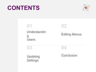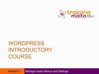 This document provides an overview of managing users, menus, and settings in WordPress. It includes sections on understanding different user roles and how to change them, editing menus and adding multi-level menus, updating site titles and taglines to align with branding and keywords, and concludes with reminding the reader to reflect on optimizing user roles and settings.