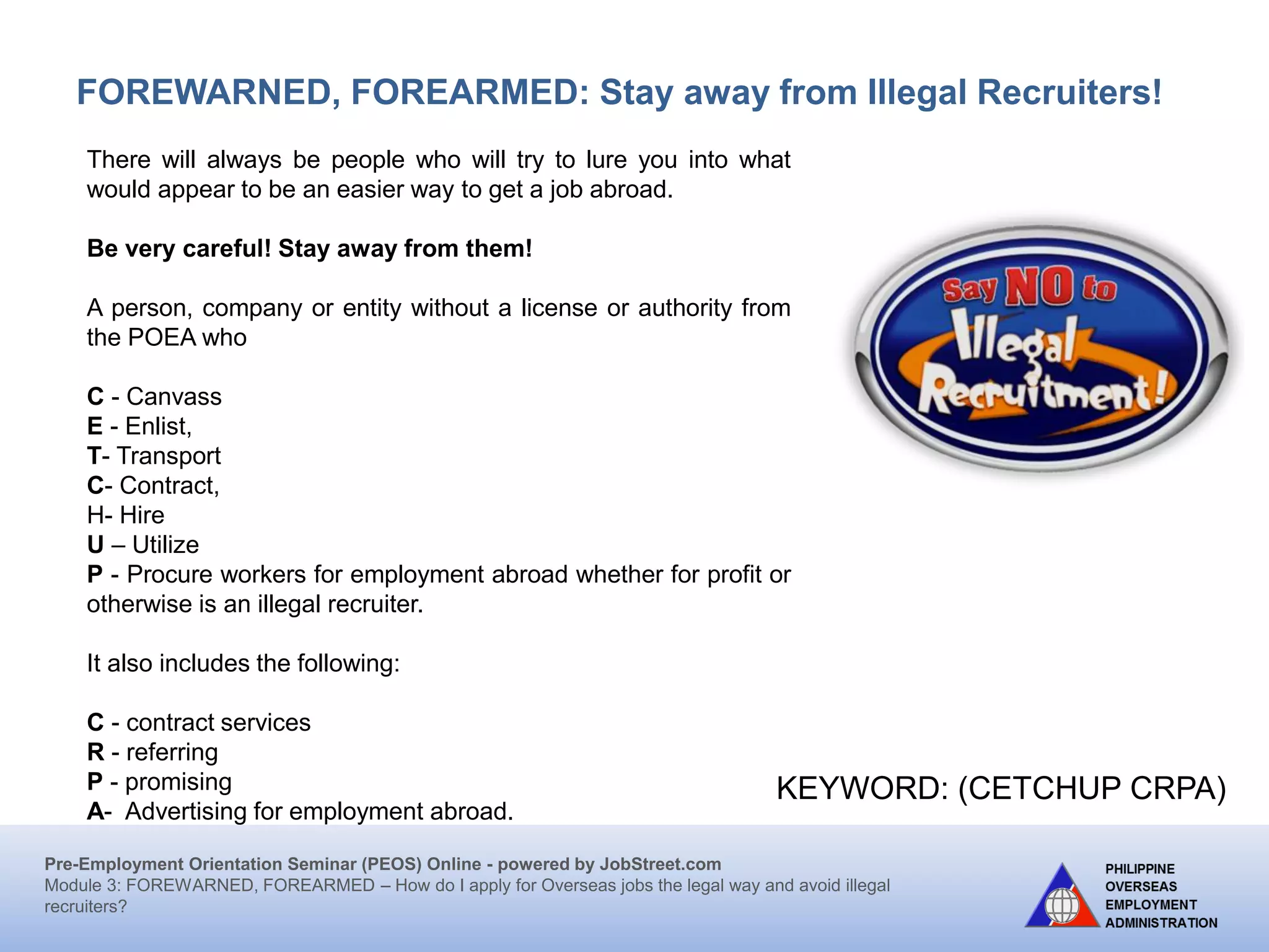 This document provides information about avoiding illegal recruiters when seeking overseas employment. It defines illegal recruiters as those who recruit without proper licensing, ask for fees without receipts, promise fast deployment on tourist visas, or claim direct employer contacts without going through proper channels. It outlines several methods illegal recruiters use to deceive workers, such as fake job offers online or through mail. The document advises only working with licensed agencies, checking for proper documentation, and paying attention to red flags like immediate payments. It warns that illegal recruiters may also be involved in drug trafficking and provides details on common trafficking methods they use.