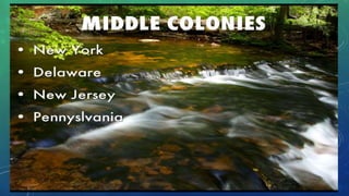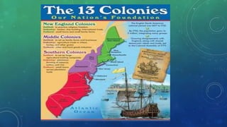 The document outlines the characteristics and motivations behind the settlement of the New England, Middle, and Southern colonies in America. It discusses the religious freedom sought by New England settlers, the diverse social and economic structures of the Middle colonies, and the plantation economy of the Southern colonies that relied heavily on slavery. Additionally, it highlights the philosophical shifts during the Age of Enlightenment and the religious revival during the Great Awakening that influenced colonial governance and societal norms.