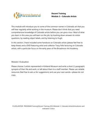 This document introduces Colorado artists that will be encountered while giving tours at a museum. It provides handouts and a DVD about Colorado artists, focusing on those from the early Broadmoor Art Academy. Volunteers are asked to research two artists represented in the Kirkland Museum and write a short paragraph about their life and work or discuss them with staff.