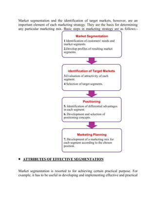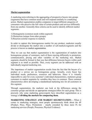 Market segmentation refers to dividing a market into subgroups of customers with distinct needs and characteristics that lead to similar responses to marketing efforts. It allows companies to target specific segments effectively. There are three main criteria for segmentation: homogeneity within segments, distinction between segments, and similar response to the market. Effective segmentation creates identifiable, accessible, profitable, and durable segments that meet unique customer needs and can be measured. It facilitates choosing marketing targets and developing tailored and efficient marketing strategies for each segment.
