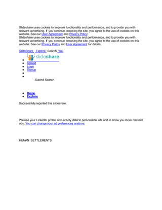The document discusses the human settlement patterns from pre-historic to modern times. It explains that early humans lived in caves, trees, and constructed temporary huts for safety and security. With the Neolithic age, permanent settlements of rectangular houses made of wood and thatch emerged. Over time, villages and towns formed and non-agricultural fortified settlements were built. The document then outlines different phases and classifications of human settlements from primitive to organized forms, and rural to urban types across historical periods.