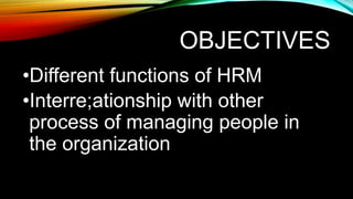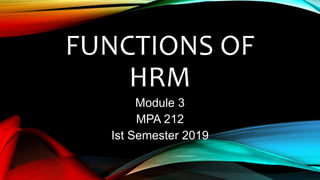 This document discusses the functions of human resource management (HRM) in organizations. It outlines several key functions of HRM including job organization and information, acquisition, maintenance, and development of employees. For each function, it provides details on related processes like job analysis, recruitment and selection, performance evaluation, training and development. It also discusses how the size of an organization's HRM department depends on the number of employees and resources. In small agencies, HR functions may be combined with other roles, while in large agencies there are often separate and specialized HR units.