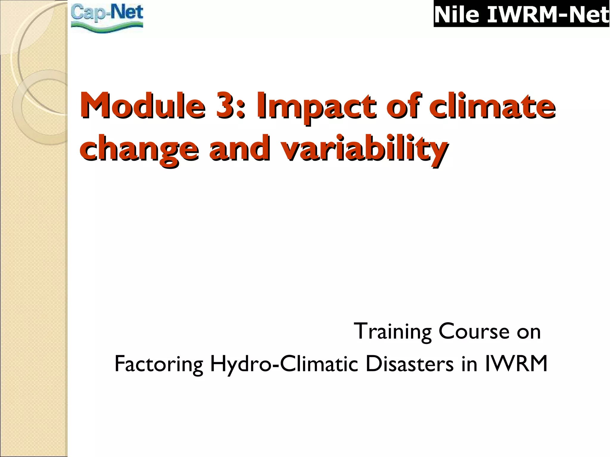 This module explains the impacts of climate change on water resources and disasters. It covers climate variability, climate change, and the effects on sectors like agriculture, energy, transport, health and water resources. Adaptation is needed to build community resilience against hydro-climatic disasters through understanding impacts and applying knowledge from the module.