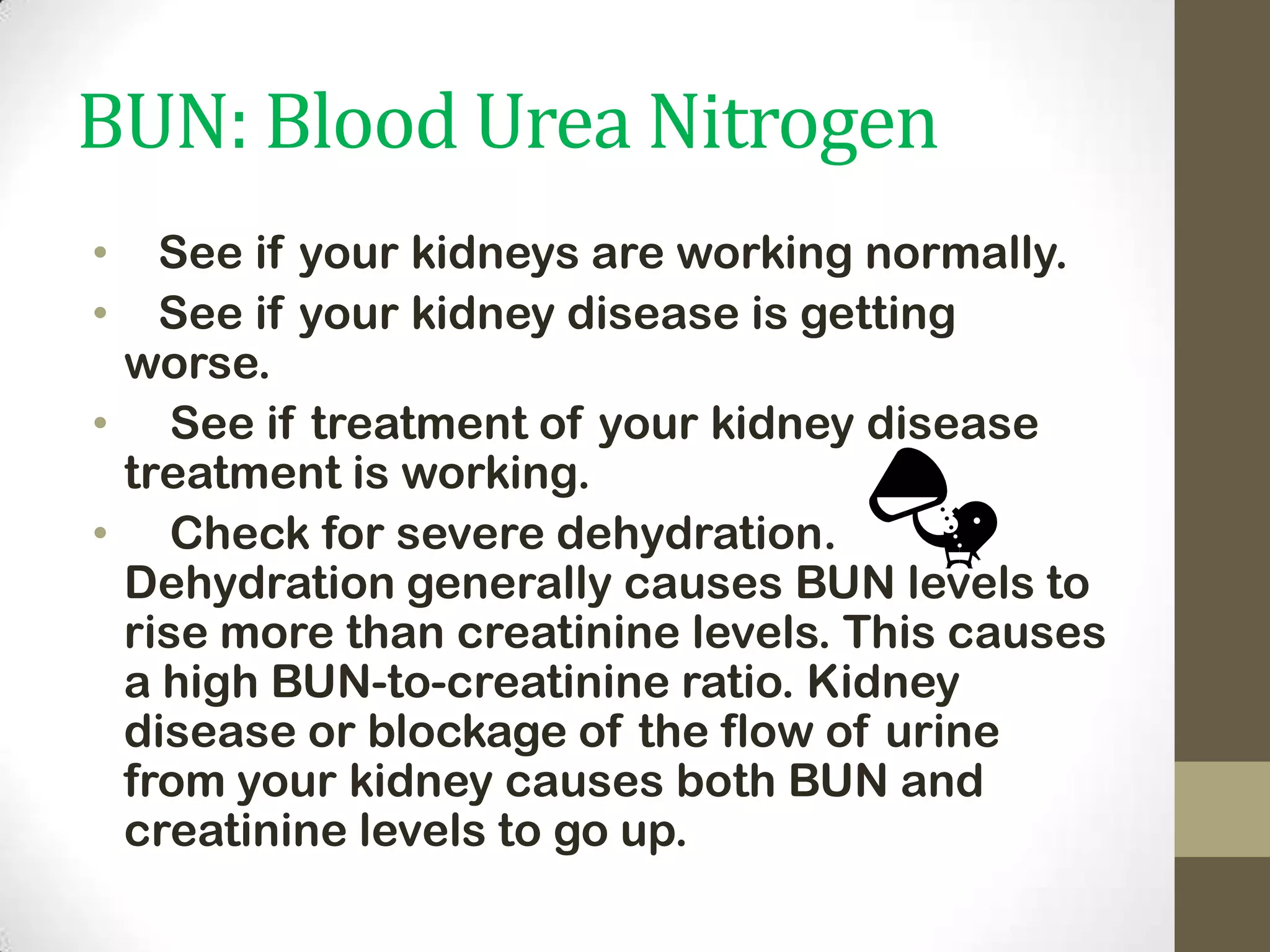 - BUN and creatinine tests measure waste products in the blood to assess kidney function and detect kidney disease or dehydration.