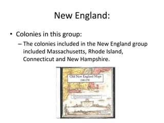 The document summarizes key aspects of the New England, Middle, and Southern colonies. For New England, it discusses the colonies included, their focus on religion and morals, and skills in seafaring. It also addresses the impact of triangular trade, the Great Awakening strengthening religion's influence, and use of Enlightenment thinking in government. For the Middle colonies, it identifies the colonies and shared traits with New England and the South. It also discusses their role in triangular trade and the Great Awakening's effect. For the Southern colonies, it names those included and notes farming, plantations using slaves, and exports. It also summarizes the Great Awakening's religious impacts and how Enlightenment thinking