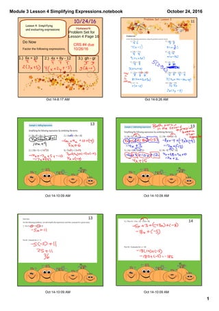 This document contains notes from a math lesson on simplifying expressions. It includes instructions for homework assignments to factor expressions and complete a problem set. The notes provide examples of using the distributive property and factoring to simplify expressions.
