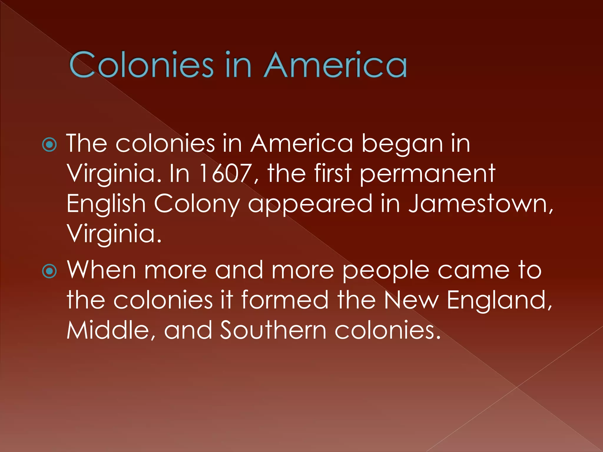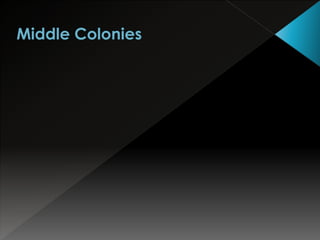 The document summarizes the origins and characteristics of the three colonial regions in British North America - New England, Middle, and Southern colonies. It describes that the New England colonies were founded in the 1600s by religious dissenters seeking freedom of worship. The Middle colonies had a diverse economy and population. The Southern colonies relied on cash crops like tobacco grown by enslaved workers and indentured servants.