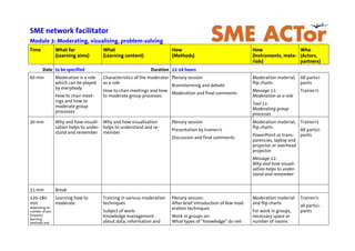 This document outlines a training module on moderating, visualizing, and problem-solving. The module is 12-16 hours long and uses various methods like presentations, group work, and discussions. Participants will learn about moderation, visualization techniques, problem-solving tools, conducting interviews and focus groups, and reflecting on their learning. The module involves both learning new content and skills through group exercises and practicing moderation and presentation skills.