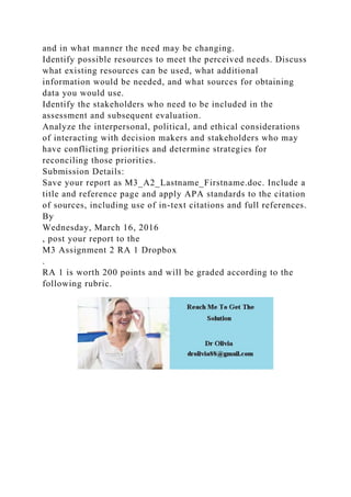 Module 3 focuses on conducting a human service needs assessment report, highlighting the importance of accountability and program evaluation in the context of limited resources. It outlines the process for evaluating a program by identifying needs, gaps in services, and the affected population, while also considering the organizational context and stakeholder involvement. The report requires a detailed analysis, supported by scholarly resources, and must adhere to APA citation standards.