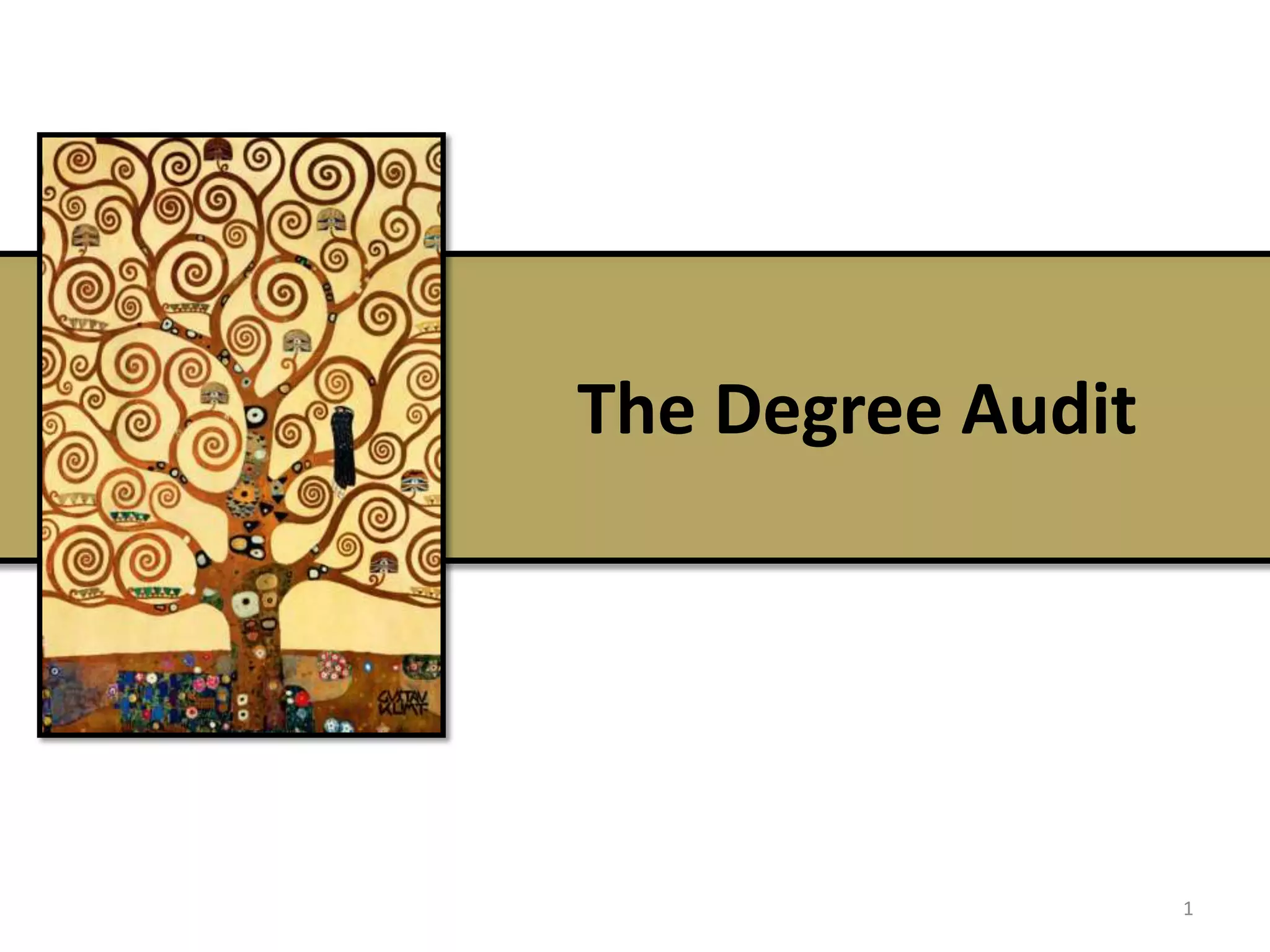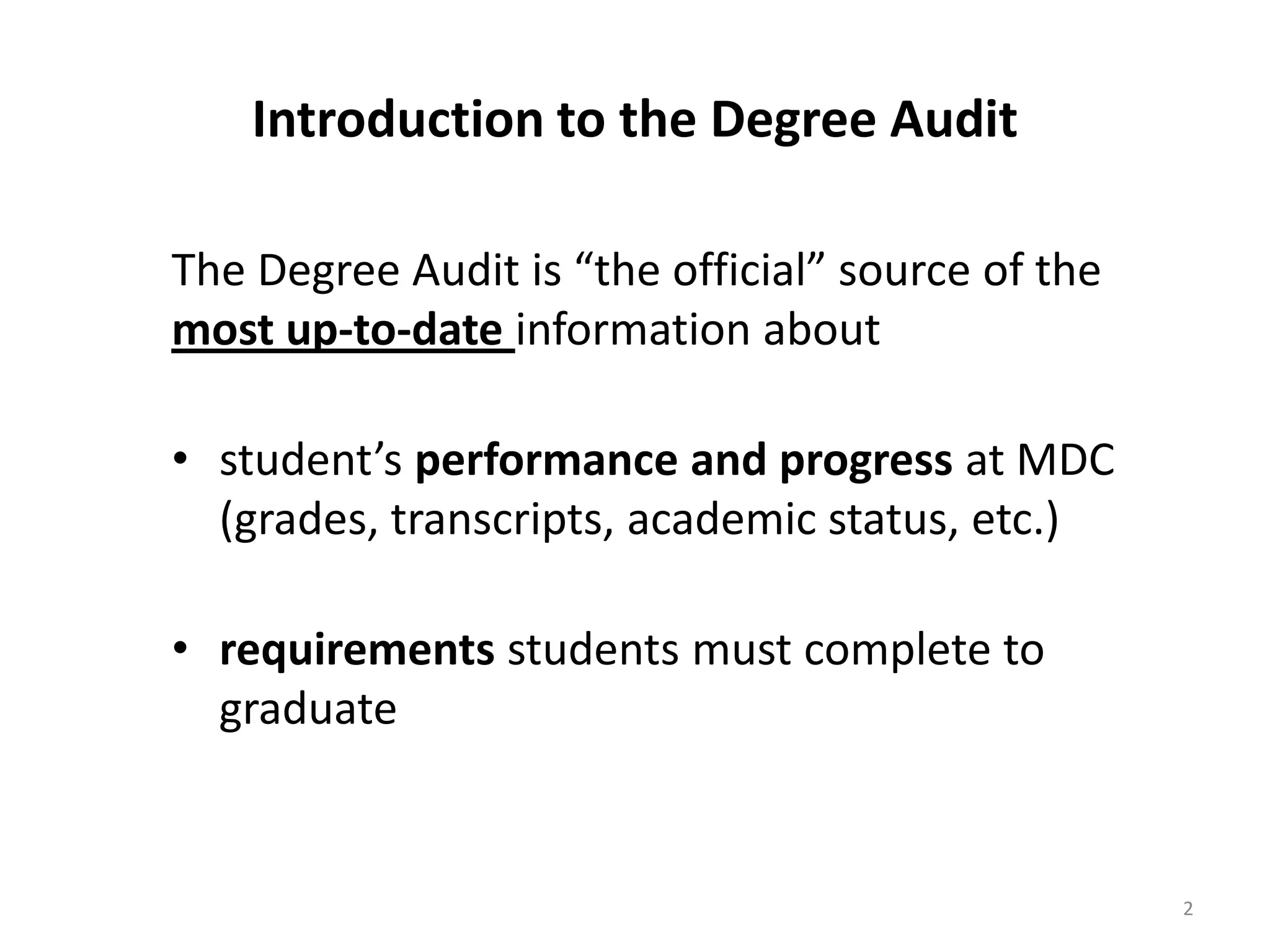 The Degree Audit provides students with the most up-to-date information about their academic progress, performance, and requirements to graduate. It outlines the general education, math, computer competency, and elective requirements students must complete, as well as any excess credits or credits not accepted towards their declared program. The audit also indicates a student's academic status, placement testing results, progress towards graduation benchmarks, and messages related to graduation eligibility.