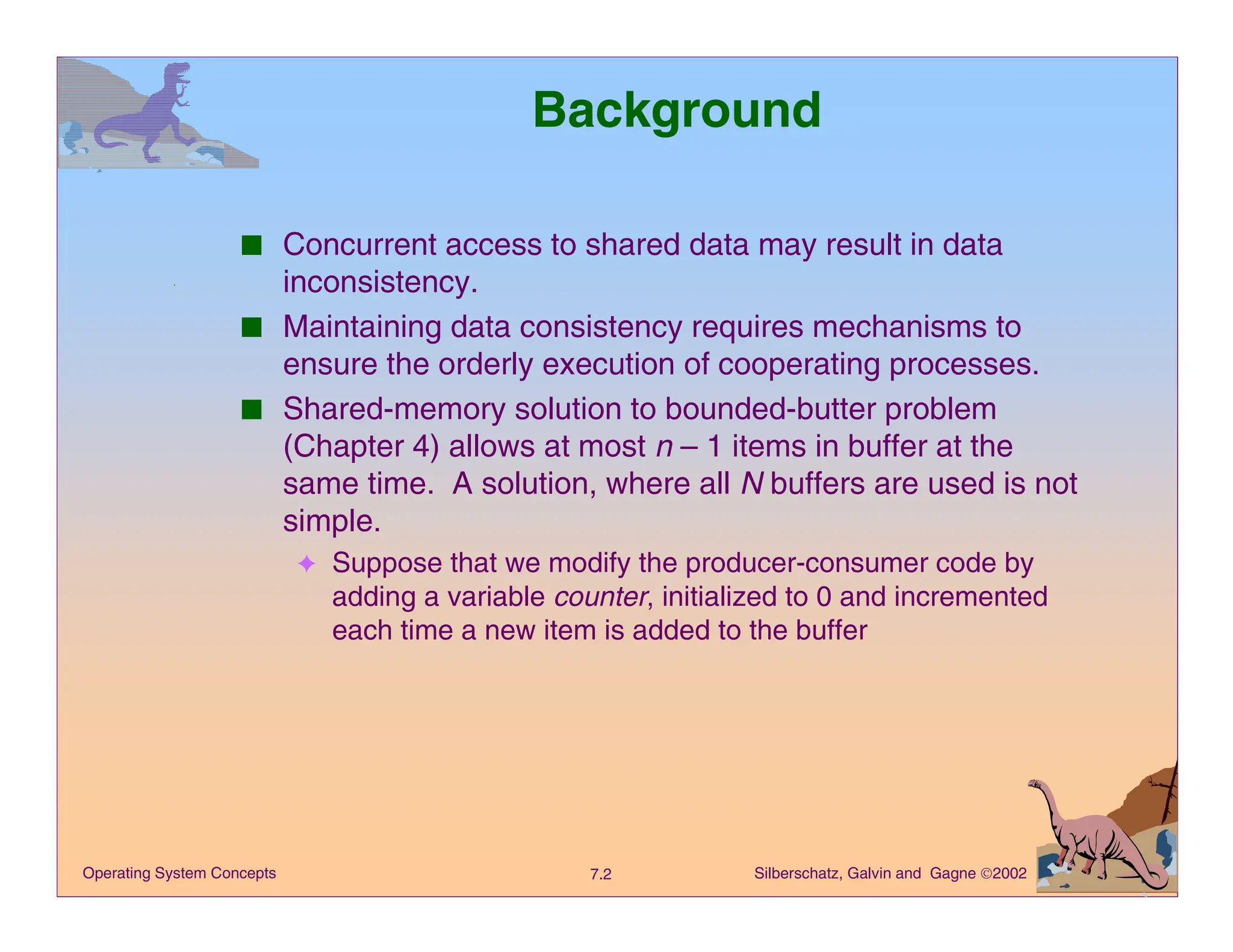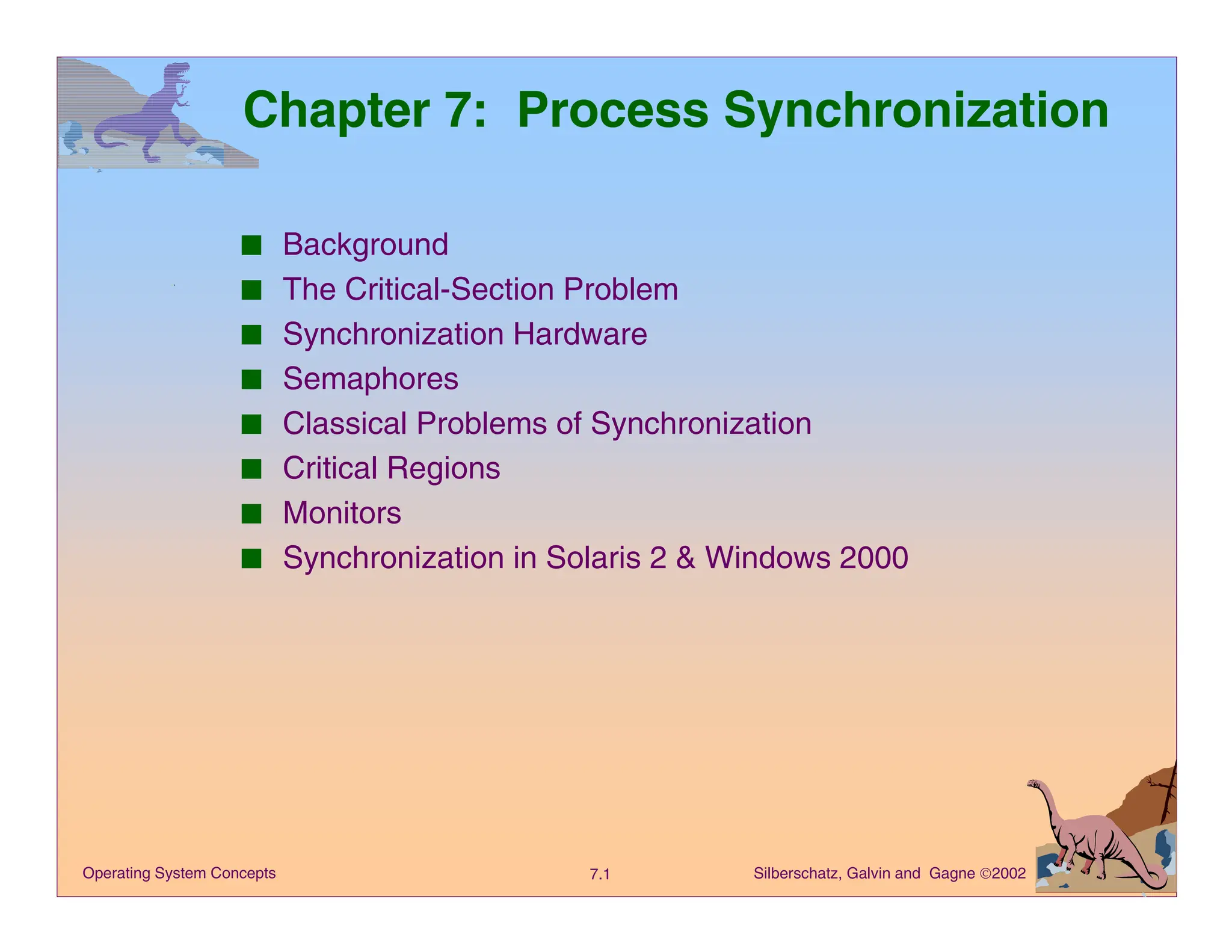 The document discusses process synchronization in operating systems, focusing on concepts such as the critical-section problem, semaphores, and classical synchronization problems like the bounded-buffer, readers-writers, and dining-philosophers problems. It highlights various algorithms and mechanisms designed to ensure data consistency and prevent race conditions among concurrent processes. Additionally, it covers synchronization hardware and the implementation of synchronization tools like semaphores to manage access to shared resources.