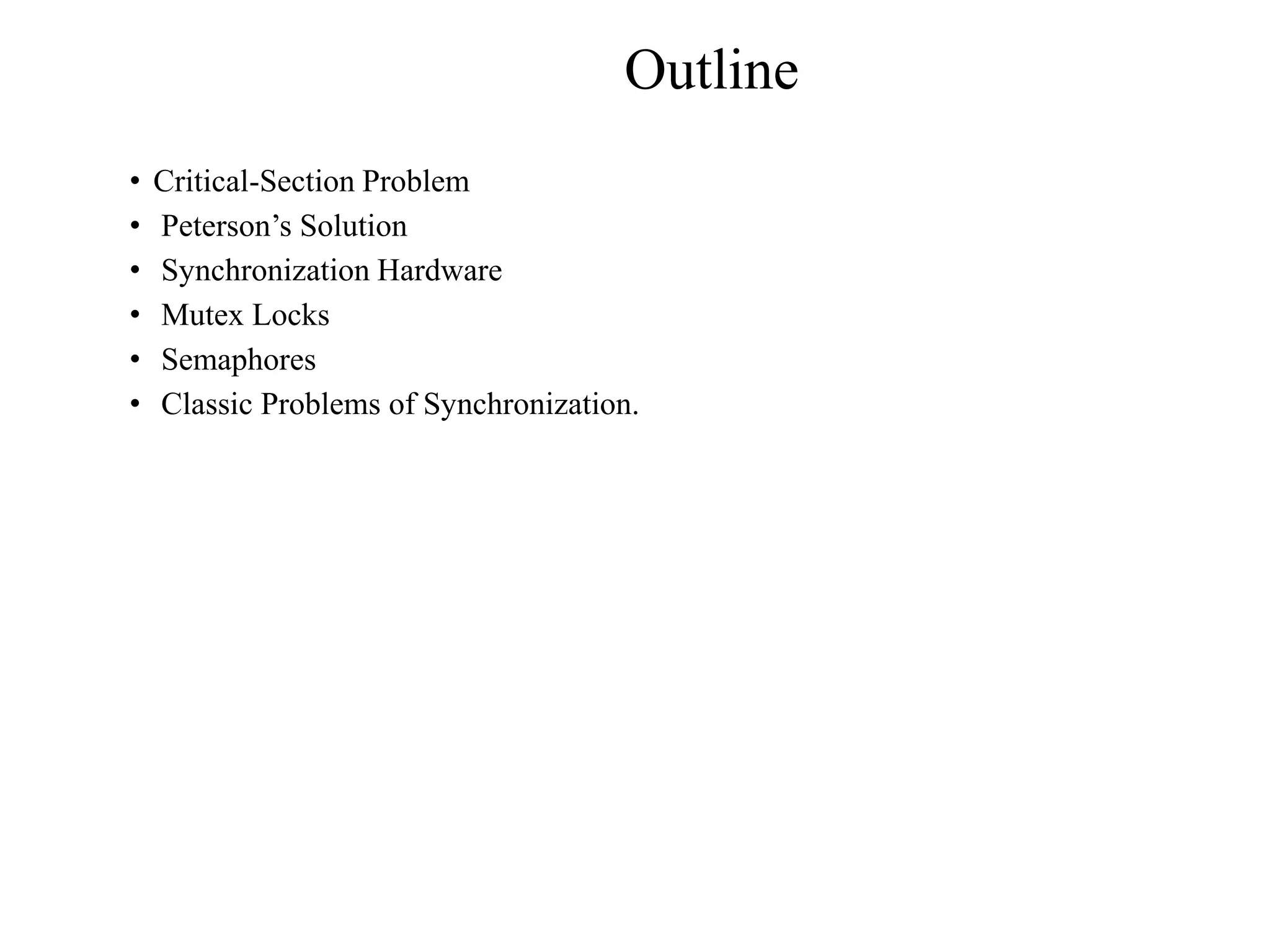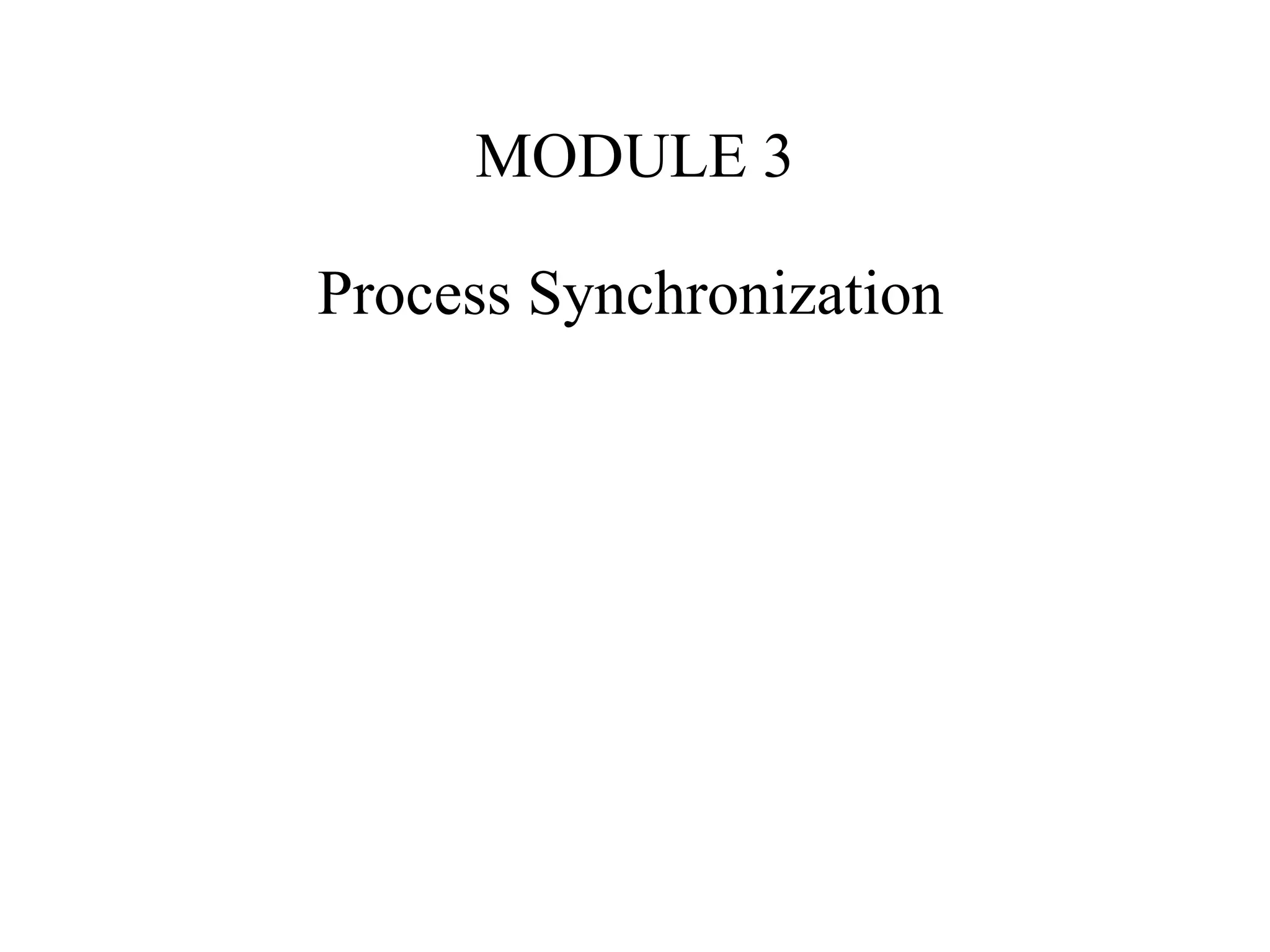 This document discusses process synchronization and solutions to the classic critical section problem. It covers Peterson's solution, which uses shared variables and atomic instructions to ensure only one process can be in its critical section at a time. It also discusses solutions using mutex locks and semaphores implemented via hardware instructions like compare-and-swap to synchronize processes. Memory barriers are introduced to address issues with instruction reordering on modern architectures.