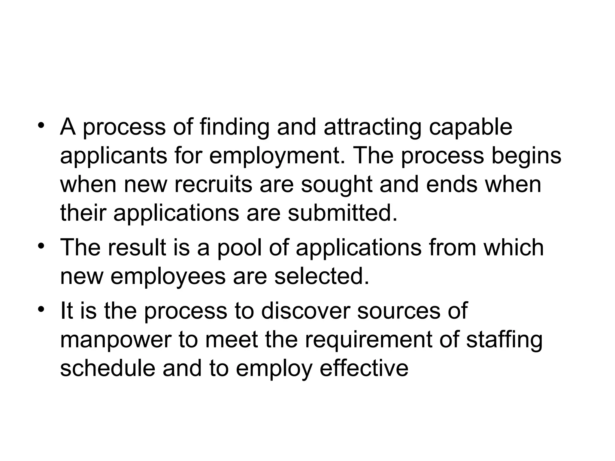 The document discusses recruitment processes and techniques. It defines recruitment as finding and attracting capable applicants for jobs in an organization. The recruitment process includes identifying vacancies, preparing job descriptions, advertising positions, managing responses, shortlisting, interviewing, and making hiring decisions. Sources of recruitment can be internal like current employees or external like job boards, agencies, and colleges. The recruitment function is influenced by internal factors controlled by the organization and external factors outside its control like economic conditions. The objective of recruitment is to attract qualified candidates and hire the best ones to meet organizational needs.