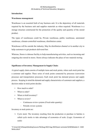 The document outlines the third module of a course on Supply Chain Management, focusing on warehouse and inventory management systems. It covers the importance of effective inventory management, different types of inventory, and the systems and procedures for stores management, including identification, receipt, storage, and issue systems. Additionally, it discusses the control of incoming materials and stock verification techniques to ensure accurate inventory management.