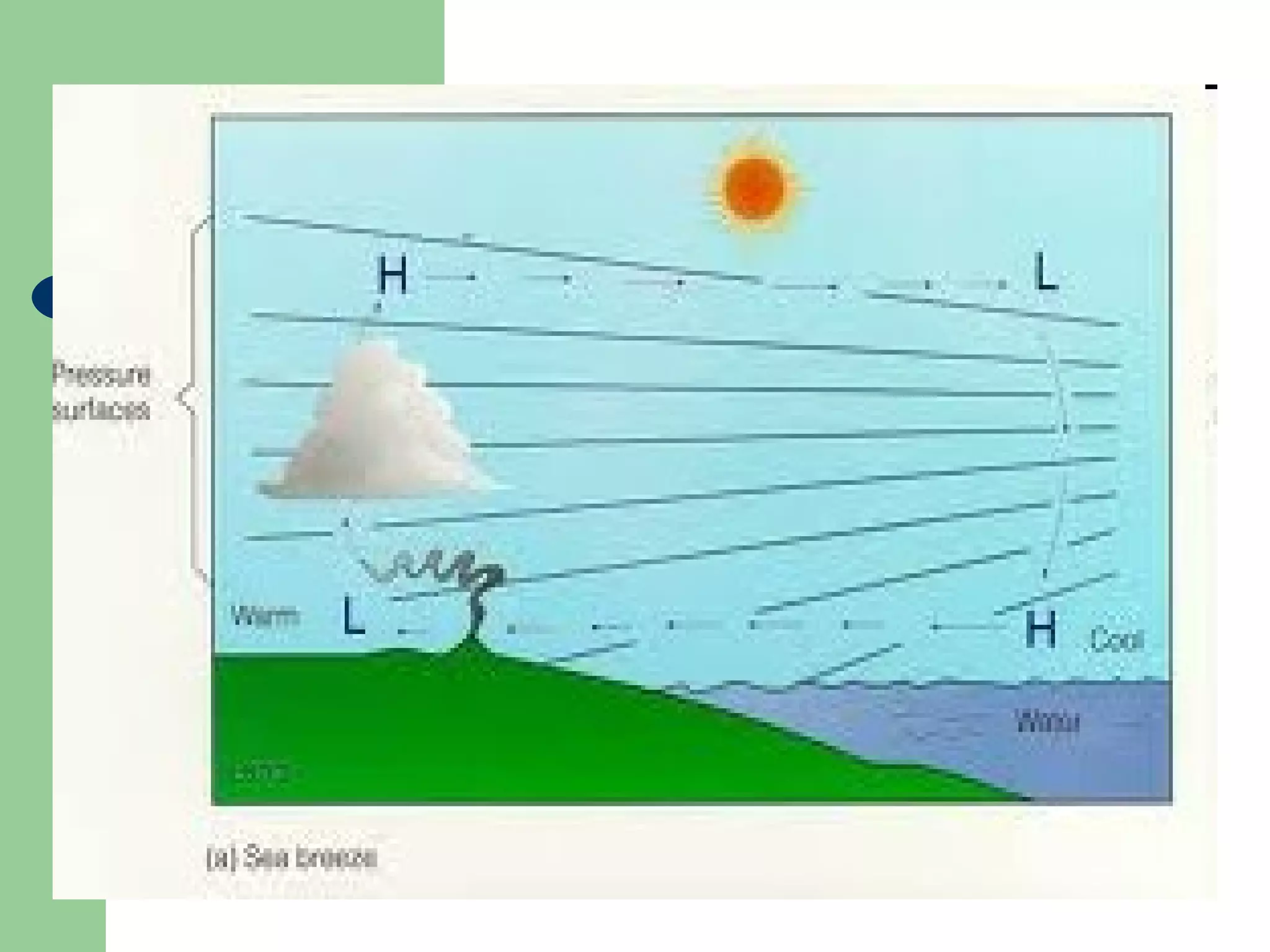 3) Sea breezes and land breezes are discussed as occurring due to differences in air pressure over land and sea during the day and night as each heat up at different rates.