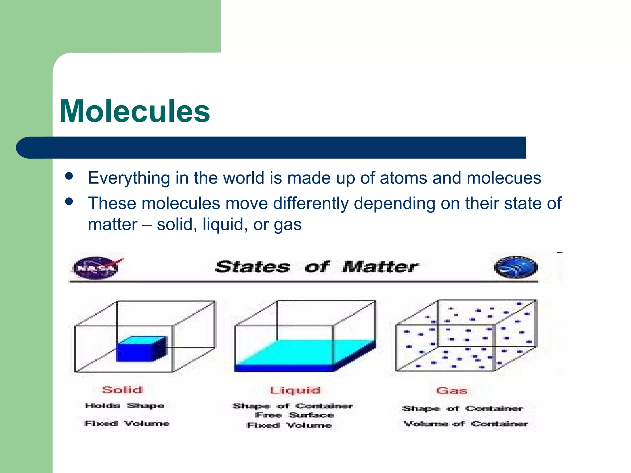 1) It describes the different states of matter - solids, liquids, and gases - and how their densities and movements differ.