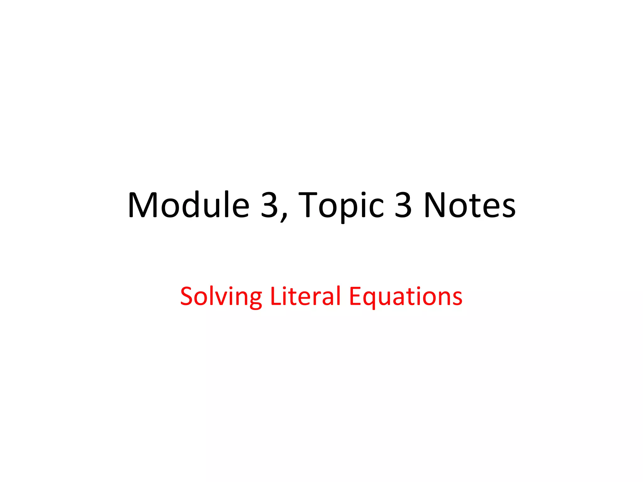 The document provides examples of solving literal equations by rearranging the equations to isolate the variable of interest. It explains that solving literal equations involves using inverse operations to get a letter alone on one side of the equation, rather than evaluating to a numerical solution. Additional examples demonstrate setting up and solving word problems involving literal equations, such as finding the constant in a direct variation relationship or using an equation to find the height of a wall.