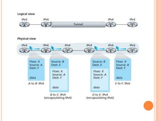 This document provides an overview of key concepts in the network layer, including the architecture of routers, IPv6, routing algorithms like link state and distance vector, and routing protocols like RIP, OSPF, and BGP. It discusses router functions such as routing algorithms/protocols and packet forwarding. It also covers topics like switching fabrics, queuing, and hierarchical routing between autonomous systems.