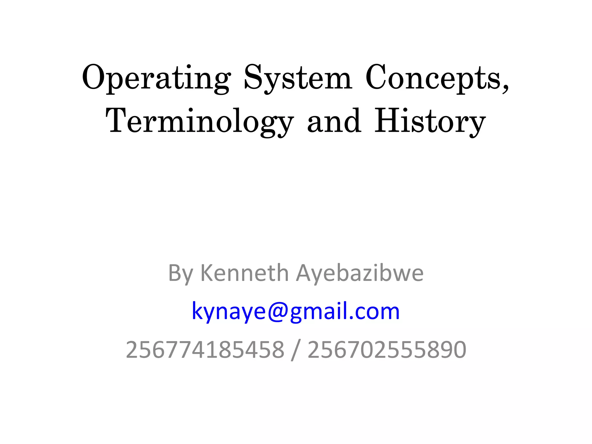This document defines operating system concepts and explores operating system history. It defines key terms like kernel and hardware architecture. It describes early operating systems as lacking robust features like memory protection and resource sharing. Modern systems improved on this. The document contrasts monolithic and micro-kernel designs. Finally, it briefly summarizes the history of UNIX, Windows, Linux and Mac OS X development.