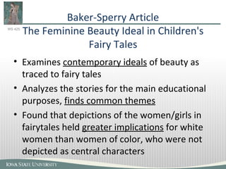 1) The Baker-Sperry article analyzes depictions of women and girls in fairy tales and finds they upheld beauty standards that privileged white women over women of color.