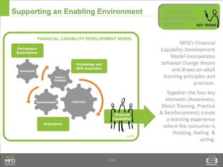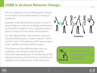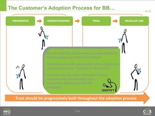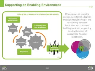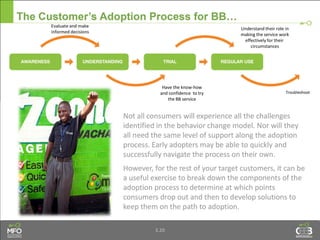 This document discusses the importance of understanding consumer behavior change when thinking about adoption of branchless banking (BB). It explains that while many people may register for BB services, far fewer are active users, so it is important to understand what prevents inactive customers from becoming regular active users. The document also discusses the different types of internal and external factors that can influence a customer's adoption process and behavior change. It emphasizes that learning should involve thinking, emotions, and doing in order to inspire action and change behavior. Finally, it presents a model for customer education and behavior change that includes awareness, direct training, practice, and reinforcement activities.