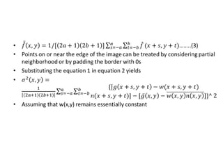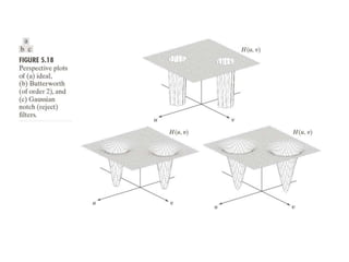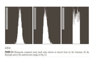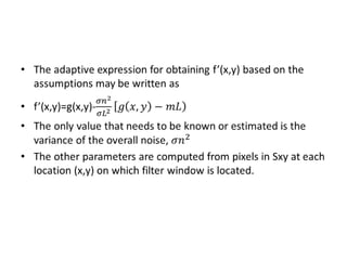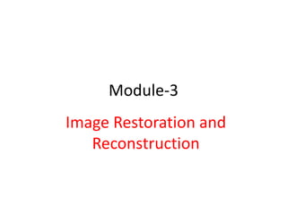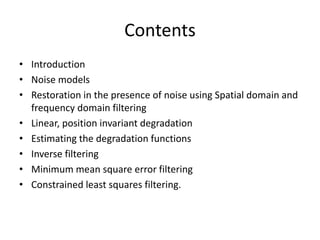 The document discusses image restoration techniques. It introduces common image degradation models and noise models encountered in imaging. Spatial and frequency domain filtering methods are described for restoration when the degradation is additive noise. Adaptive median filtering and frequency domain filtering techniques like bandreject, bandpass and notch filters are explained for periodic noise removal. Optimal filtering methods like Wiener filtering that minimize mean square error are also covered. The document provides an overview of key concepts and methods in image restoration.