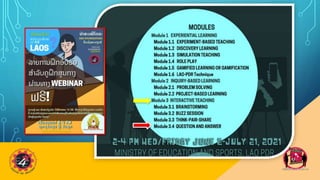 This is the final(15/15) webinar module reference material for Pedagogical Content Knowledge (PCK) for Lao Teacher Training of the Ministry of Education and Sports, Lao PDR, with assistance from the Education for Employment Sector Development Project (EESDP) with the Asian Development Bank. This initiative is a convergence effort of the Department of General Education (DGE), Research Institute for Educational Sciences (RIES), the Dept. of Teacher Training (DTE) and the Institute For Education Administration Development (IFEAD). Packaged by Project Implementation Consultant (PIC) Intem Philippines